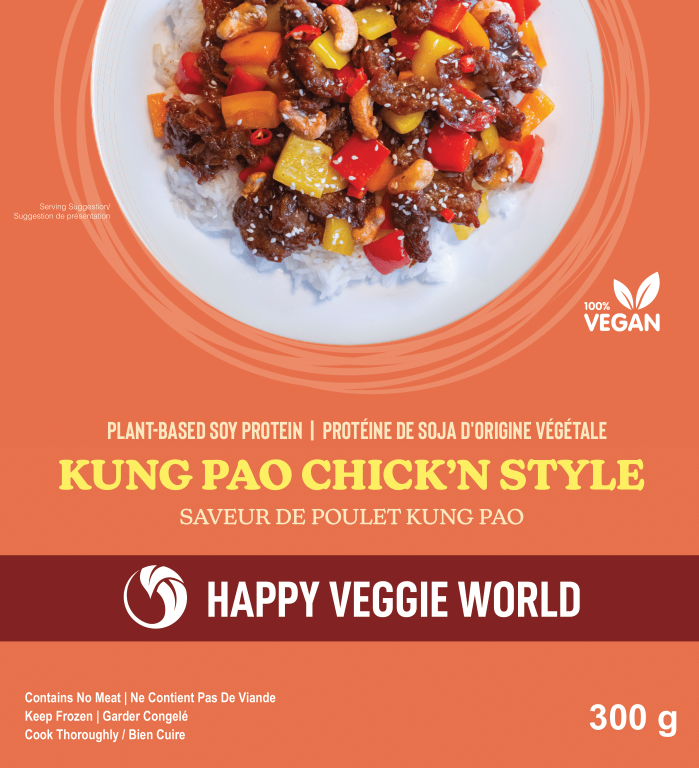 Textured soybean protein (non-GMO) (soybean protein, wheat protein, wheat starch, calcium carbonate, calcium sulphate), Water, Soybean oil, Sugars (liquid glucose, raw cane sugar, trehalose), Soy sauce (water, soybean, wheat, salt), Isolated soybean protein (non-GMO), Wheat protein, Corn starch, Artificial vegetarian flavourings, Salt, Dried chili, Yeast extract, Disodium ribonucleotides, Glycine, DL-alanine, White pepper powder, Transglutaminase, Cinnamon, Dried orange peel, Star anise, Clove, Cardamon, Sichuan pepper.
